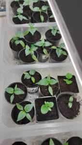 Юлечка, перцы положила на проращивание 23 февраля на влажные диски в соусники, перед этим замачивала в эпине 3 часа, так делаю 3 года . Прорастали по разному, самый первый назавтра пророс, из своих семян, и первыми прорастали мои семена . Сажала в покупной грунт наш белор. РостАгро, чёрный,  сыпучий,пролила стаканчики прямо кипятком из чайника, остудила , долго прорастали, долго настоящие листики выпускали, стоят под лампами обычными диодными под 2мя по 4000 К, утром включаю, в 22 выключаю, сейчас одну лампу отключила, стоят под 1й . Поливаю отстоянной водой аккуратно прицем, поднимаю стаканчики, если лёгкие.  поливаю, иногда в поддон.Подкормила Радифармом, лингогуматом , потом фертикой для рассады,