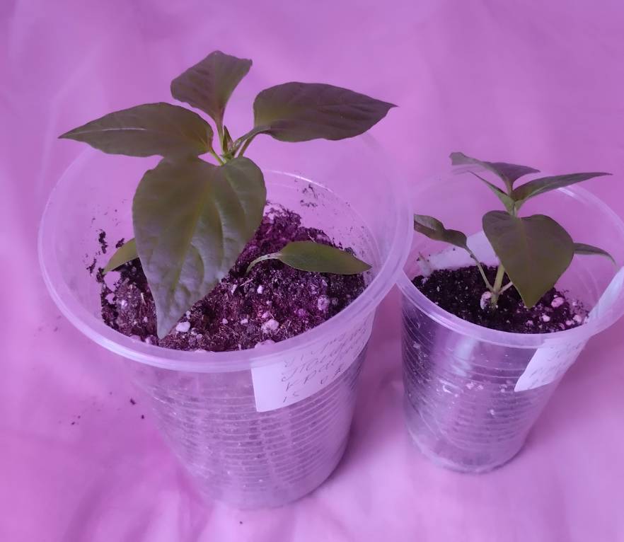 Взяла два своих перца, тоже посеянные 23 февраля, один растет в 500 гр.стаканчике, другой в 200 гр. разница в развитии есть.