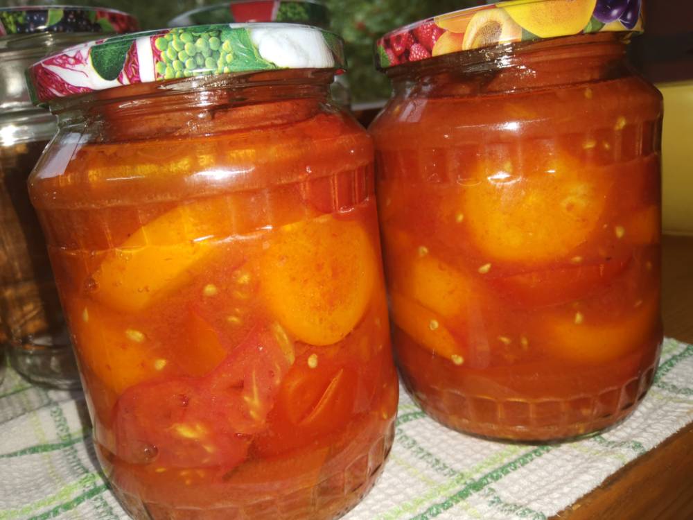 Поздно вечером вчера закрыла две банки типа Ачучук, закидала резаные дольки в банки и поставила стерилизовать на 30 минут., добавляла, когда осели,хотелось так попробовать.