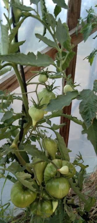 У меня еще вся кисть не окрасилась. Тоже хотелось бы снять всю кисть целиком. Но не знаю как получится. Окрашиваются и спеют они долго. У меня те, что вчера с мужем пробовали окрашиваться начали еще две недели назад. Мои тепличные помидоры в этом году растут на перегное без удобрения я не добавляла в теплице совсем. Побоялась, что будут жировать. Черничный щербет растет и в теплице и в ОГ. В Ог еще не спеет. В ОГ в лунки сыпала перегной и Осмокот. По листу не кормила. То дожди залили, а теперь уже стали поспевать.