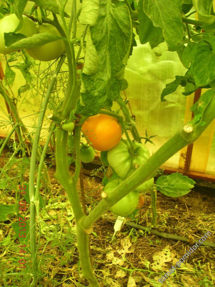 У меня в этом году растут сорта от форумчан, у которых и на 2-3 кистях плоды крупные(200-300грамм). Но все сорта по 1шт растут, в ПК теплице, так что не могу сказать, что так было бы на всех допустим 150 кустах. Это индеты Чудо Земли Украинское, Розовые крупные от Нинули, Дакоста португальская, Бабушкино, Сызранка и Киевлянка. Во весь рост не могу их сфотать-тесно в теплице, соседние кусты мешают. Вот Розовые крупные попыталась: