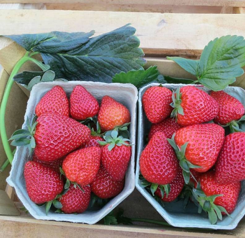 Ягода конической, слегка удлиненной формы, цвет от кирпично-красного до ярко-красного, с сильным глянцем. Мякоть плотная, сочная и очень ароматная, напоминающая запах лесной клубники. Сладкий и нежный вкус сохраняется постоянным в течение сезона. Ягода отлично подходит как для употребления в свежем виде, так и для приготовления джемов и кондитерских изделий.