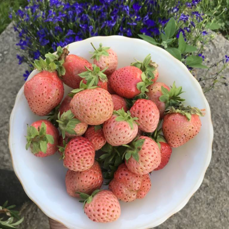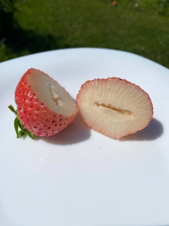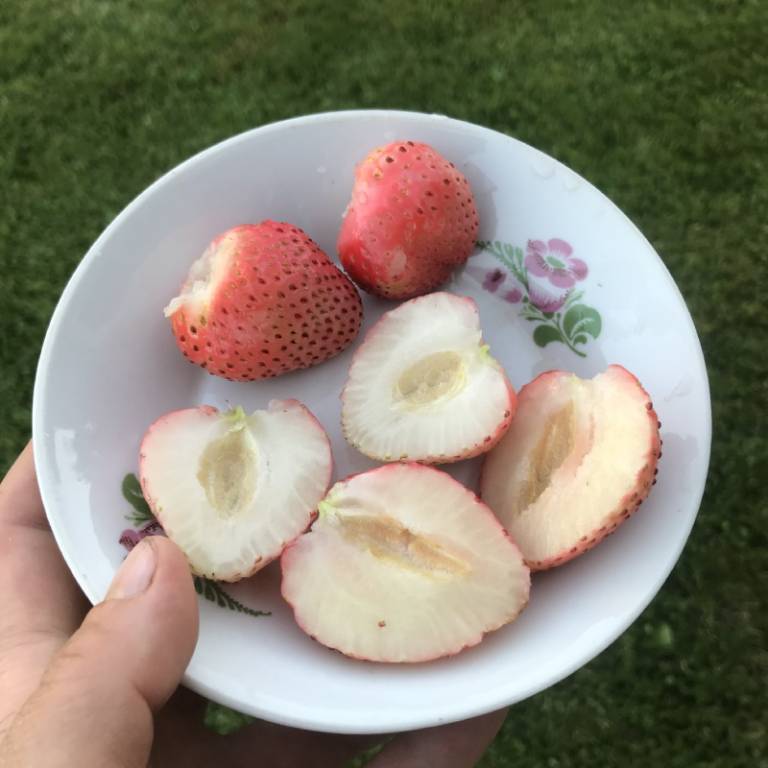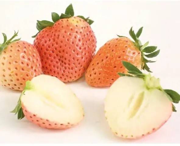 Плоды клубники красивой округлой формы, среднего размера – 20-30 гр., мякоть сочная, во вкусе ярко выражены ноты ананаса и персика. Что касается цвета, то по мере созревания ягод, их зеленый цвет меняется на белесый. Под воздействием солнца клубнички могут получить оранжевый или розовый оттенок. Как только семена Бианки становятся красными, ее можно употреблять в пищу, это главный признак спелости этого сорта белой клубники.