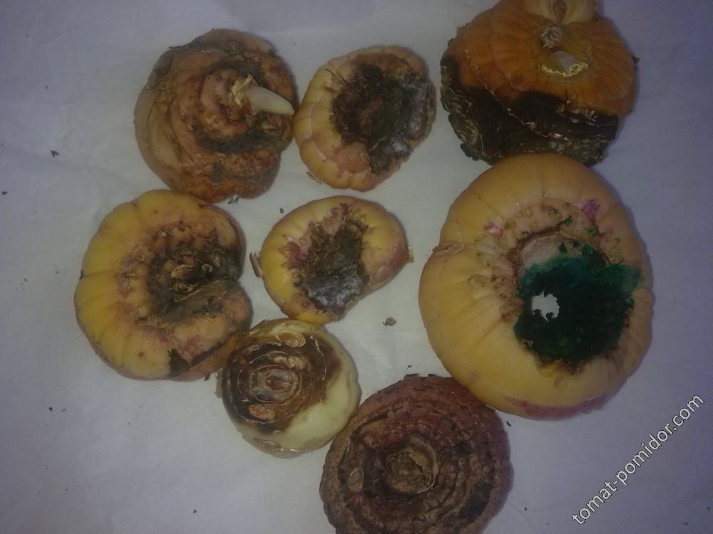 Хорошо в этом году сохранились луковицы- трипса на них нет, и болезней не много. На следующей фотке это то, что совсем плохое, на выброс, а вот на следующей- еще посмотрю. Луковицы плотные, здоровые, а вот сверху какой то рыжий оттенок, как ржавчина. Сначала было решила, что трипсы почикали, но даже в двое очков не увидела ни одной зверюги. А ведь ящик то самый нижний стоял и тем боком, откуда вытащила всех этих, как раз был в сторону холодного угла. И сделала вывод, что это наверно подморозилось немного. Поэтому оставлю их и посмотрю, как поведут себя. Если болезнь, то она проявится.