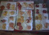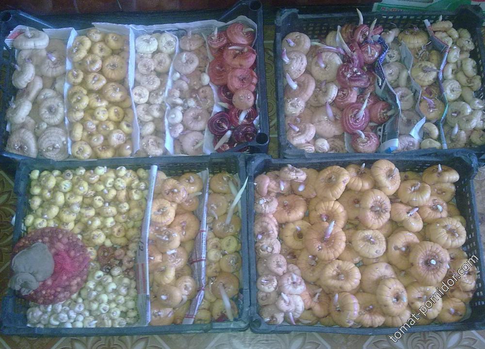 И заодно уж очистила и новые сорта, которые развожу с прошлого года. Их всего у меня 26, каждого сорта от 1 до 3 луковиц и детка у каждого, только у каких то ее  :hey:, а у других по чуть-чуть. Разложила их по коробкам на проращивание. Только бы не перепутать, они лежат на своих подписанных пакетиках. Надо сшить мешочки из спанбонда и разложить в них, тогда надежнее, не перепутаются. За зиму у этих новых сортов погибло 3 луковки, правда уже осенью видела, что 2 уже не жильцы, но пожалела, обе были из одного сорта. Теперь вот осталась одна.