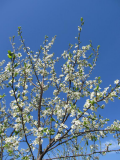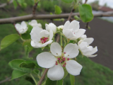 И с установлением тепла все стало быстро расцветать! Груша, та, которая разломилась и осталась одна ветка. Груша эта ранняя и зацветает самой первой. Слива зацветает. И терновник облитый стоит!
