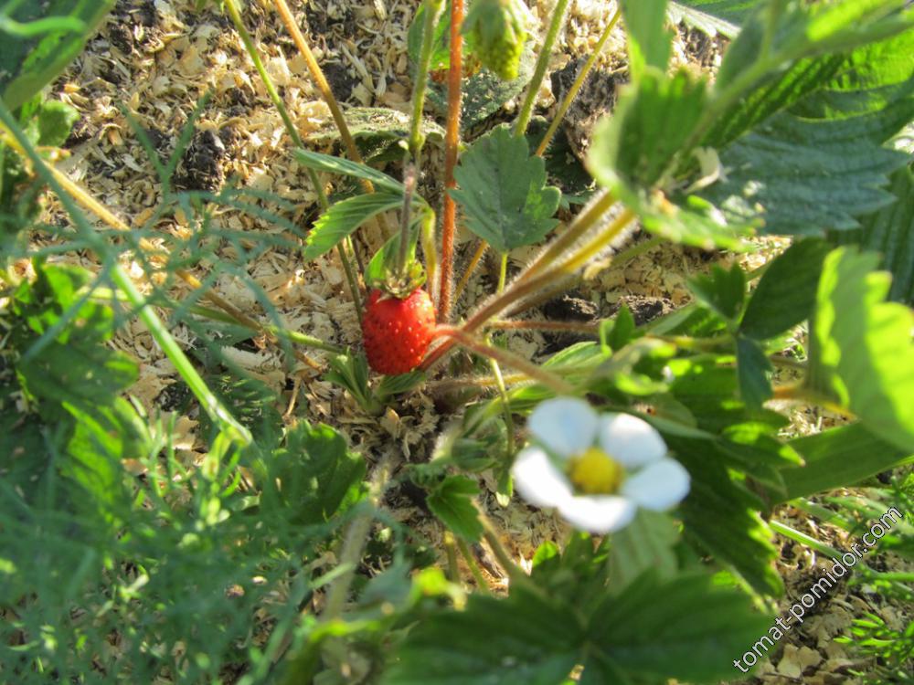 И земляничка начала спеть. Ее много, но мелковата. А вечером поливать стала и нашла на Полинкиной земляничке тоже покрасневшую ягодку, вот эта покрупнее и сладкая :niam:. Спасибо тебе, Полинушка!