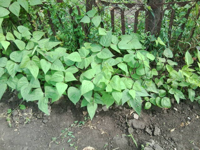 Ну а за кукурузкой по над забором я посадила разную фасоль и с сиреневой лопаткой и с желтой и вигну , а между забором с фасолью и кукурузой посадила Любушкины тыковки .