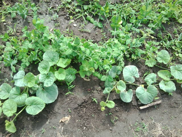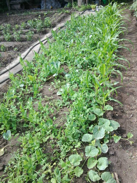 Ну а здесь у меня растет грядка горошка в неё я подсадила позднюю капусту с краюшку кукурузку хлопанку и четыре дыньки Манго -это та которая самая маленькая в мире и помещается на ладони . Сначала я ей хотела сделать не большую шпалерку но потом решила пусть плетется на дорожку . Уже на ней есть первые завязи .