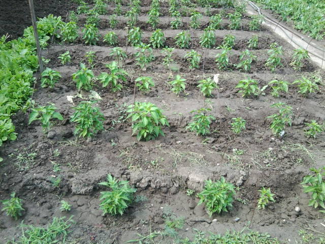 А это мои острые перчики . Посадила много разных сортов от наших дорогих девченочек ! Любушкины перчики просто завараживают . Правда на первой фото видно работы полно надо и полоть и пушить .