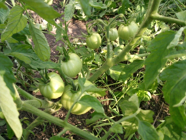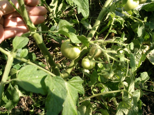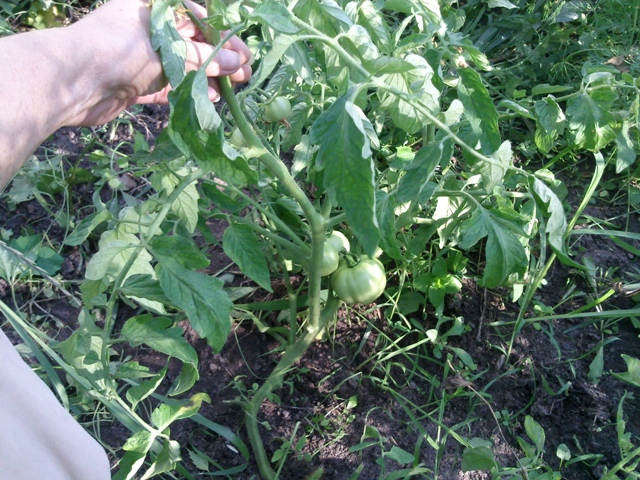 Радует самосев. Без тепла, без ласки валялись до вчерашнего дня да еще и в сорняках. Навязали кучу плодов и первые помидорки уже светлеют. Сжалилась, решила подвязать - а они по стволу корни пустили. Вырывать не стала, подвязала только то, что выще. Глядя на них, вспомнилось, как во времена СССР ездили на уборку помидоров. Вот именно такие помидоры росли в полях - валялись как придется, а плодов море. И никаких болячек. Вот почему так - одни ухоженные, подвязанные (не дай Бог листик земли коснется) болеют, хиреют, а другие на земле, в сорняках, влажность убйственная - как солдаты и море плодов. Вот только не могу определить пока что это за сорта у меня насеялись.