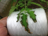 Молодые листья томатов заворачиваются внутрь трубочкой — кучерявятся, а старые листья желтеют, засыхают по краям. Сначала листья темнеют, затем по краям появляются желто-коричневые пятна, которые постепенно разрастаются, образуя кайму.