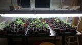 Здесь 99 стаканчиков (снимок 28 марта), в пустых скоро появятся всходы, потом схему размещения поменял и получилось 110 стаканчиков. Свет 3*72 Вт, 16 часов в сутки. 4 отдал на работе, еще 4 под самодельной фитолампой держал месяц - выросли менее 1 сантиметра вверх за время облучения светом, но корневая в разы лучше той, что под ЛБ росли.