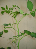 Томаты с излишне генеративным развитием. Такие растения, наоборот, могут быть относительно высокими, но с компактным листовым аппаратом. В дальнейшем, при возрастающей плодовой нагрузке, растение сильно замедляет или приостанавливает вовсе вегетативное развитие. Листья короткие, темно-зеленые, макушка растения тонкая (тоньше 1 см у индетерминантных томатов), кисть простая, короткая, с одновременно цветущими несколькими ярко-желтыми цветками. Плоды в кисти одного размера и завязываются хорошо. Верхняя кисть расположена почти у самой верхушки растения, менее 15 см от нее. Соцветия отходят от побега не под острым углом, сильно загнуты вниз. Цветков в соцветии меньше обычного, хотя кисти продолжают цвести и завязывать плоды. На растении одновременно цветет одно соцветие. Пасынки слабые или вовсе прекращают свое развитие. У таких растений «все силы» брошены на развитие плодов, но в ущерб развитию листового аппарата и корневой системы, что также скажется на общем урожае.