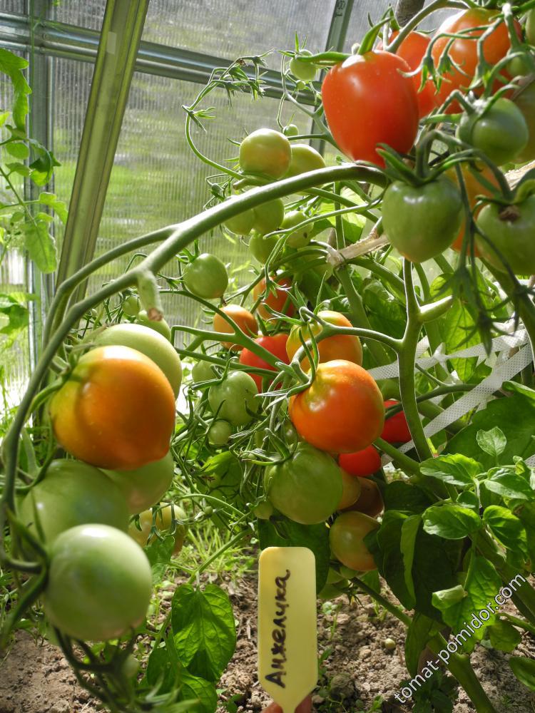 Анжелика очень урожайная  :yep: Естессно, если не пасынковать, все кисти завязала, пропусков не было. Куст раскидистый, не штамбовый, до 50-60см, требует подвязки стеблей. У меня урожай растянуто отдавала, у неё помидорки спелыми могли довольно долго на кусту висеть и не трескаться-плотненькие, при этом хорошего вкуса. Можно и в банки, универсальный сорт  :)