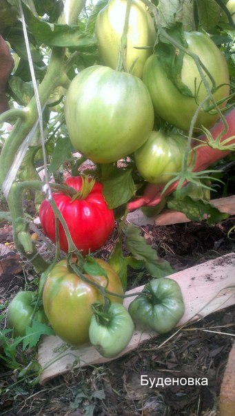 3-е фото Лунный Восторг от Марины с Сочи поспевает скоро (кисть ещё на кусте висит) 5 больших помидорок, я даже подпорки поставила. Он у меня раньше поспеет чем Золотые купола :yep: