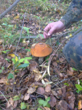 У нас сады окружены лесом со всех сторон,вот только леса непроходимые.Мы ходим в лесок за домом,но там уже не тропинки, а тропы целые.Благо что не за урожаем ходим,а погулять.Набираем на жареху или супчик.Хотя в электричке народец с грибами ездит,белые везут,подосиновики.Я вот тоже белых хочу,да видно не судьба,местов не знаю,где они водятся.Или бы груздей черных на засолку.  :niam:Вот один красавчик.