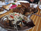 На обратном пути наш друг Навигатор все-таки решил подшутить над нами и завел в какой-то тупик. Пока мы из него выбрались на дорогу... потом проехали нужный поворот… Короче, обратно мы ехали уже другой дорогой, через Черкесск. Дорога, конечно, лучше, но и поток машин в разы больше. Погода испортилась, туман совсем на землю опустился. В общем, ехали долго и тяжело. Мужчины наши были ооочень злы на Навигатор (  :-X и даже поругивали его нецензурной бранью  :- ). Путешествие наше все-же завершилось благополучно. Дома на мангале запекли рыбку и доели недоеденную в Кисловодске баранину. А мы с Ленуськой еще и шампанского бутылочку осушили) Кстати, очень вкусное шампанское BOSСA. Напоминает Асти Мартини, но цена гораздо бюджетнее.