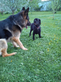 Похоже с другими собаками не общался, но уже с нашими нашел общий язык. Но предпочитает общество людей.