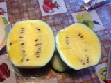 Это у меня вообще-то совершенно не запланированный арбуз, из семян F2 японского гибрида Коцубуко. Был у меня для опытов. :D F2, как и положено, дал расщепление, и один арбуз у меня получился полосатый, а второй зеленый. Но вот этот полосатик оказался весьма неплох, 12.5 по шкале Брикса.