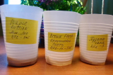 Семена насыпаю в сложенные вдвое ватные диски, диски – в подписанные заранее стаканчики.  Наливаю сверху воду с растворенной кальциевой селитрой и эпином. .