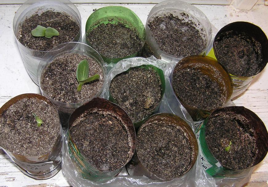Сажаю  в такую тару, какая имеется. Вот мы наделали много стаканов из винных и пивных бутылок. В них и  сажаю.  Вроде еще пару семян корни выпустили, посадить надо сегодня.