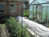 У меня грядки 11-ти метровые. По краям грядки вбиты трубы от старого водопровода и в центре грядки тоже. К этим трубам приварены еще трубочки, получатеся буква Т. А сверху на эту букву Т положили длинные арматурины десятки. Очень удобно, На все опасно выступающие края железок одеты куски резинового шланга. У нас сынок маленький, поэтому безопасность прежде всего, никаких кольев в огороде нет.