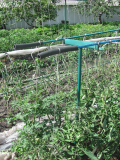 Есть шпалера из труб, попроще. Просто труба вбита по краям грядки и еще одна по центру, а сверху приварена другая длинная труба. Томаты сажу в шахматном порядке и подвязываю к одной трубе. При такой шпалере очень редко позволяю разгуляться в два ствола. Но зато очень удобно чередовать грядки с огуречными) Один сезон помидорки, на другой к трубе сетку вешаю и огурцы растут) Типа севооборот!