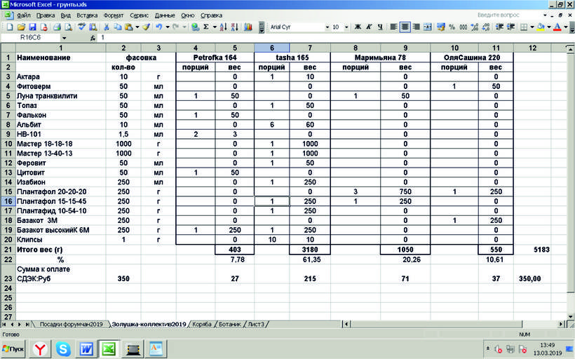 Девочки! @tasha @ОляСашина @Маримьяна пришла Химия от Золушки. Стоимость нашей посылки 350 руб. Выкладываю расчет стоимости доставки на каждого участника, исходя из веса индивидуального заказа. Если есть вопросы, пишите в личку.