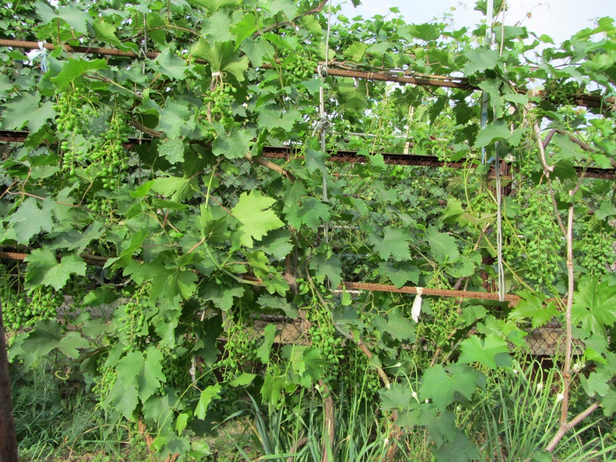Покажу вам, как не надо ухаживать за виноградом.  Как-то пустила я на самотек несколько виноградных кустов, с весны подвязала, не посчитав почки, а потом муж подвязывал, а я и не посмотрела внимательно и когда цвел не обратила внимания. Вчера увидела, просто обалдела. Весь в кистях, кустик небольшой, приростов почти нет. Сегодня сфоткала, вечером половину кистей оборву. Сорт Фламинго, он сам не регулирует завязь, сколько оставили, столько и будет выращивать. При этом расти почти не будет и лоза не вызреет, и не только урожая несколько лет не увидишь, но и придется его выхаживать...