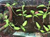 Но каково же было моё изумление, когда я обнаружила два всхода томатов в цветке, который стоит в тёмном месте дома, да и с семенами вообще никак не контактирует  :o! Просто шок! Откуда там помидоры????  ??? Они, конечно, вытянулись, но я их всё равно пересадила в плошечки под пакетик и на окошко :hid:. Интересно, что же там за сорт  :D.