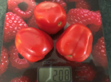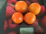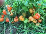 6.Вологда град F1(от Надюши RNA) - Из описания - крупные (290-350 г) и плотные оранжево-красные плоды, даже снятые спелыми, лежат еще около 40 дней при комнатной температуре и не портятся. Среднеспелый высокоурожайный индетерминантный гибрид с отличным плодообразованием и слабой побегообразовательной способностью. Кисти - компактные, с 4-5 крупными плодами. Собирают их при появлении красной окраски. По факту: Мощный куст, с толстым стеблем и крупными листьями, помидорки крупные и завязываются всей кистью, и было их много, долго лежат, и в спелом виде, и дозревая. Интересная особенность – сорванные зелёными помидорки созрели, но не покраснели, остались жёлтыми, были использованы в запечёное мясо с помидорами. Вкус… ну, это с чем сравнивать… Короче, обычный помидорный, когда дозарились(ну, те, которые не покраснели) стали точь в точь, как лучшие из магазинных  ;). Так что – для гибрида – очень хорош, но всё же для меня лучше сорта…