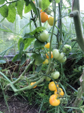 Про ОГ даже писать не хочется… :'(  Не то, чтобы не было урожая, но то, что было – треть от прошло- и позапрошлогодних… :( Ну, разве что в клумбе   удались Утенок , Коралл , и, относительно, Fuzzy Wuzzy. Почему Fuzzy Wuzzy относительно? Да потому, что  цвёл и плодил вовсю, а вот зреть начал очень поздно, так что собрала его в середине сентября почти весь зелёным. А дозаренным – уже вкус не тот. Но каждый кустик из этих трёх дал по пол-ящика помидорок, так что я с этой клумбы, с 7 кустов,  сняла три с половиной ящика помидорок, с учётом того, что Утёнок и  Коралл созревали раньше, и частично ушли в банки.