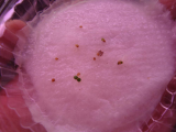 Один пакетик семян земляники решила  проращивать на ватном спонжике, так как семян, посеянных в землю обычно не видно и не понятно, что с ними происходит. Так вот из пачки семян только 2 шт не проклюнулись, остальные уже с корешками и два даже с листиками.