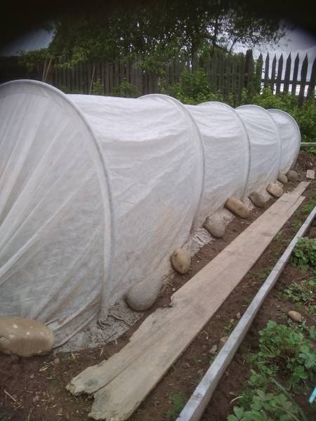 Я их цыганскими кибитками называю:)). Дуги у меня срезаны на концах наискосок, в землю втыкаются хорошо. Агрил не рвется, использую третий год. Но конструкция так себе, шаткая, надо дополнительно снизу прижимать досками, кирпичами, камнями, чтобы ветром не полоскало. Все ими закрываю - капусту от блох, землянику от птиц, фасоль от холода.
