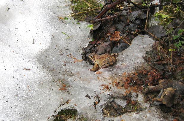 Жабка (или лягушка - я не очень разбираюсь) бодро прыгает по снегу. Остановилась только чтобы на меня посмотреть и попозировать.
