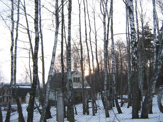 он над крышами домиков, чуть пониже верхней кромки леса...