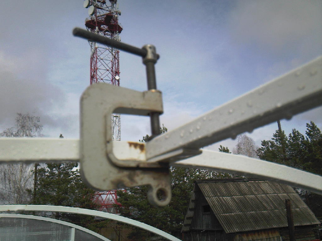 Хотелось бы добавить немного комментарий. Для того, чтобы монтаж теплицы превратился в радость, чтобы сохранить не один миллион клеток своего организма, необходимо приобрести, или позаимствовать у соседа по гаражу пару струбцин. Без них просто БЕДА. ОООЧень трудно монтировать ригеля. В целом на установку каркаса у меня было потрачено: