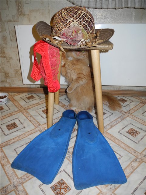 Ласты, купальник и кокошник нашла, а вот рога от стены не оторвать. Может быть можно рога и мужика заменить на шлепанцы?