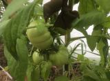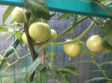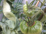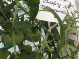 Ангелина, это полосатый шоколад из твоих семян. Красавец, как по мне. Даже зеленый удивительно нарядный.  Глянцевый неимоверно, как игрушка. Это самый крупный плод, причем он на второй кисти, а не на первой, почему-то - видимо место удачное. Вообще на шоколаде хватает завязей, но этот плод мне просто очень нравится, я по нему скорость налива остлеживаю. Он с пол-ладони где-то.  Подозреваю, что семена я буду брать именно из этого томатика...  :D