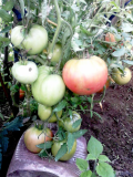 После сборов сейчас висят 36 завязей, помидоры не очень крупные, грамм 300, но сахарная розовая мякоть, когда разламываешь, оня прямо вся искрится, а вкус!!!