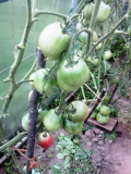 Галя, если у тебя грабельки, то у меня граблищи. Полива у меня вообще нет, только то, что в бочку с неба попало, тем и поливаю лейкой по огороду. А Роза Ташкента у меня из форумских хотелок. Ничего не хотела, а ее как увидела, так не то что захотела, возжелала. Ну мне Джамиля (ей уже ,наверно, икается, каждый день благодарю) и прислала. Тогда многие хотели , и ваши питерские. Растет она у меня в ПК и пленочной. Но ведет себя по-разному, надо ей место,наверно, подбирать. В пленочной более тепло, она раньше начала зреть, я думала как ранний сорт, но он средне-ранний. В пленке она более низкая (1м) , в ПК до 1,5 м.Но она по-разному вела себя и в рассаде (сажала как и все инд. 26.02), были быстрорастущие (пошли в ПК), и еле взошедшие. Вот все деты и выбраковку ИД посадила в пленку, надо убирать жалость, не относится к росточку как к живому существу, а выбрасывать. В пленке все плоды сверху с трещинами, в ПК гладкие. Но вкусные там и там. Конечно, когда была жара и ночные в мае-июне 7-8 тепла, а то и заморозки, то пропуски были. Но за вкус готова все простить. Еще плюс. Вчера стригла, так на ней, в отличие от других сортов, все листья здоровые, зеленые.