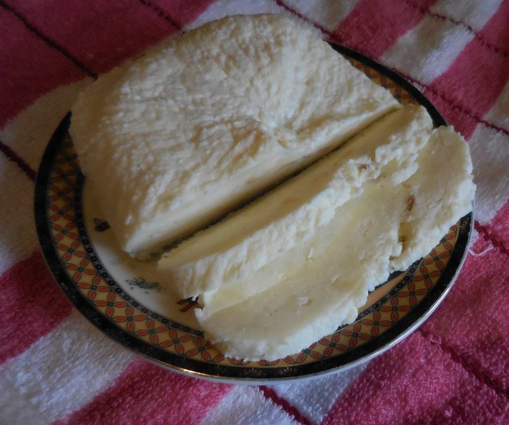 Отпрессованный кусок сыра освобождаю от марли и опускаю в солёную сыворотку, выношу на холод на 12 часов.