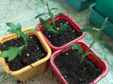 Сегодня ночью ещё минус будут, а завтра на разведку плошка с лишними перцами и ещё несколько томатов отправится. А потом уже наверное и всё остальное. А то все растюхи головами в вышестоящие полки упираются. Вчера тасовала туда сюда, а томаты так и норовят друг за друга уцепиться, несколько листьев обломала. :-