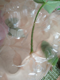 И у меня опять неожиданности! Впервые удалось корни получить у листа :o. Сажала подаренные черенки, листьев многовато было, срезала, поставила в стакан с водой и забыла. А сегодня что то вдруг захотелось посмотреть... и один лист оказался с корнями. Вот ни разу не удавалось получить корни у листьев. Ну я не имею в виду сенполии- у них ведь размножение как раз листьями, они и совсем другие, с толстыми черешками. Посадила в стаканчик. И задумалась- откуда росток то будет, и когда ;). И на некоторых черенках пеларгоний уже бутоны появились! :yep: А вчера еще огурцы закопала по кругу в стаканчики. Очень уж Зозули вытянулись. На фотке один оставила как есть, сантиметров 8-10 точно будет торчащий стебелек. Закопанные по кругу в тех же стаканчиках под семядоли вроде пока живы. Буду дальше наблюдать. И что удивительно- посаженные огурчики другие на несколько дней ранее Зозули совсем не вытянулись и семядоли у них какие-то болезные. Вот и что и по какой причине? Возможно семена старые, а может им не понравилось в замочке сидеть? Зозули сразу как наклюнулись, в землю определила, и результат, семядоли мощные, стебли огромные... Ну а еще из необычного- бакопа голубая, Блютопия начала цвести... а они ведь сидят все в одном, нераспикированные. Быстрее бы отвезти все в огород и там рассадить... :-