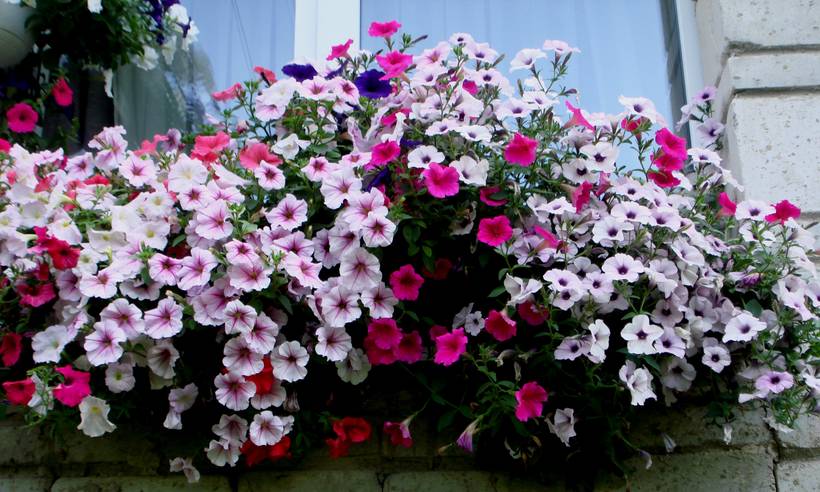 Прекрасные ампельные петунии серии Опера, особенно хороши Raspberry Ice, Pink Morn, White (белая) и Red. В подвесные горшки подойдут отлично, но и горшки должны быть объёмом не менее 5 литров.