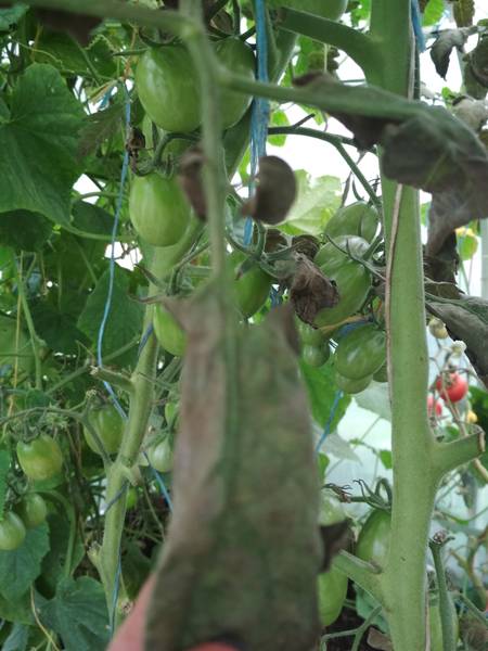 Помогите пожалуйста понять что это и как с этим бороться. На листьях в июле появились коричневые пятна, потом листья стали засыхать и рассыпаться в труху. Засохли цветовые кисти и стали сохнуть стволы. Плоды не набрали свой размер и зрелость. Теплица три года как построена. Моем после уборки урожая, ещё в теплице огурцы.