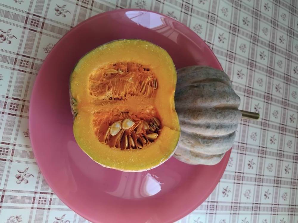 У меня почти аналогичная ситуация получилась с голубым Хоккайдо. Приятельница попросила сфотографировать несколько сортов тыквы и я решила устроить масштабную фотосессию, с красивым фоном, аккуратно разложить по цвету и сортам... и пока я всё это группировала у одной (самой красивой) тыквы Блу Хоккайдо отвалилась плодоножка, а под ней тёмное пятно:shocked:. Сначала я хотела пятно зачистить и оставить дальше на хранение, а потом думаю, это знак (!), надо тыкву сожрать продегустировать. Запекла в духовке, без специй, божечки, как же было вкусно. Тыква в меру сладкая, крахмалистая, структура мякоти, как очень густой крем. Короче, тыква кончилась очень быстро, я поняла, что соскучилась по тыквам и стала искать следующую жертву.
