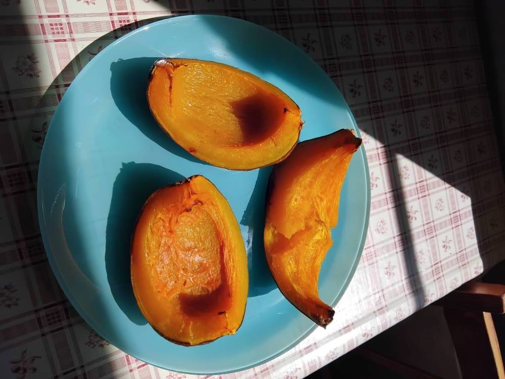 Следующей стала самая маленькая голубенькая тыква из семян покупной из Магнита, которую в результате дискуссии было решено считать дочкой Сампсона. Эта тыквочка больше всего напомнила мне картошку, очень-очень вкусную, сладковатая, сухая, очень крахмалистая, при запекании разваливалась на кусочки как варёный картофель.