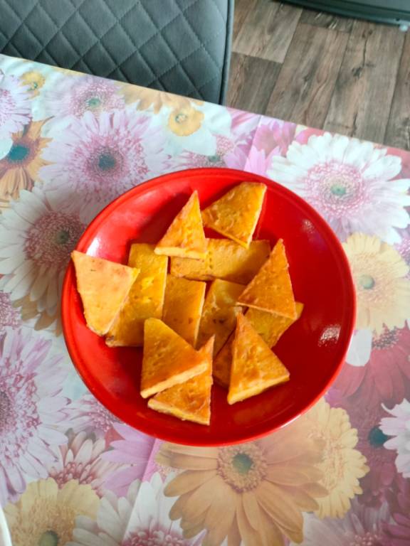 В общем мякоть после обжарки с перцем, солью и в муке оказалась вкусной. Но по вкусу совсем не батат, а ближе к кабачку.